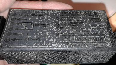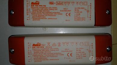 Gruppo di otto trasormatori elettronici input 220 volts output 12 volts. Carico ammissibile 20 - 105 W per i quattro Relco a sinistra della foto; 50 - 150 w per il Relco con copertura verde; 20 - 60 w per Osram; 10 - 60 w per Sharkgo; 35 - 110 w per Trasfitalia Boxer 10W B.