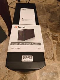 UPS trust da 1500 VA, l'ups viene fornito senza batterie! Dotato di 4 prese IEC - Eroga temporaneamente l'energia della batteria durante le interruzioni di corrente; evita la USB per monitorare lo stato dell’UPS, ricevere avvisi e spegnere automaticamente il computer - Le prese protette da sovratensione impediscono danni dovuti a colpi di corrente, picchi e fluttuazioni - La funzione AVR garantisce una stabile tensione di uscita a 230 V - Porta RJ11 loop-through con protezione da sovratensioni - Chiari indicatori ottici e acustici per gli allarmi - Protezione da sovraccarico e cortocircuito - Robusta struttura esterna in metallo. Gruppo di continuità compreso si cavo USB per collegarlo al PC e due cavi di alimentazione vedi ultima foto...