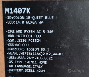 È un AI PC alimentato dal processore AMD Ryzen™ AI 5 340conNPU da 50 TOPS, 16GB di RAM DDR5 e un SSD da 512GB. Dispone di un display IPS da 14 pollici WUXGA (1920x1200), antiriflesso e scheda grafica AMD Radeon™ Graphics. Con Windows 11 Home, Wi-Fi 6, Bluetooth 5.3, 2 porte USB Type-C, HDMI e una webcam FHD IR con privacy shutter. Offre anche standard di resistenza militare MIL-STD 810H e audio SonicMaster