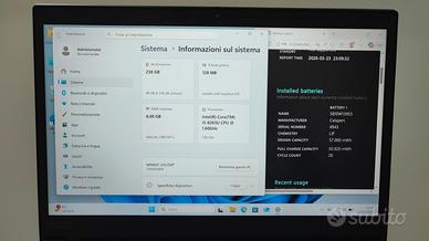 UltraBook Lenovo T490S 14 pollici ultraleggero pesa 1300 grammi CPU : Intel I5-8265U Disco : NVME 256 Disco a stato solido NVMexpres RAM : 8GB DDR4 Schermo : 14 Pollici FHD molto luminoso ( no graffi , no macchie, no impronte di tasti ) Batteria 50Wh su 57Wh , cicli meno di 30 vedi foto, Praticamente nuova dura più di 3 ore. alimentatore usb TipoC, Windows 11 pro Originale installato pulito, porte usb, HDMI e jack audio + microfono , webcam. Le foto sono esattamente del prodotto in vendita. Ha 2 piccoli segni sul lato sinistro del coperchio. Per il resto è stato usato pochissimo in ottimo stato. Spedizione assicurata mediante servizio TuttoSubito. Posso consegnare in zona Affi - Trento.