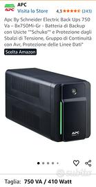 Vendo gruppo di continuità della APC by Schneider per esigenze di alimentazione maggiori. Possibile consegna a mano su Torino o spedizione. Specifiche Collegabile direttamente a Nas o Pc con cavo USB per un controllo più diretto in caso di blackout, se manca la corrente il NAS o il PC si spengono automaticamente nel tempo stabilito dall'utente quando l'ups funziona a batteria per evitare perdite di dati. Alimentazione batteria di backup 750 VA / 410 W 4 uscite "Schuko" protette e con backup di batteria La regolazione automatica della tensione (AVR) protegge i dispositivi collegati stabilizzando i livelli di tensione in ingresso UPS ideale per dispositivi per uffici domestici e intrattenimento domestico; Modem e router, smartphone, PC desktop, storage collegato in rete. La protezione della rete dati da 1 Gb protegge dati e dispositivi preziosi. 160 x 120 x 355 mm (AxLxP)