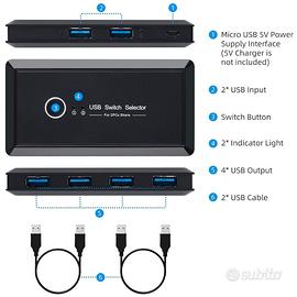 · Interruttore a un pulsante, connessione multiporta: consente uno scambio di pulsanti tra 2 computer per condividere 4 periferiche USB3.0 senza scambiare costantemente cavi o impostare complicati software di condivisione di rete.