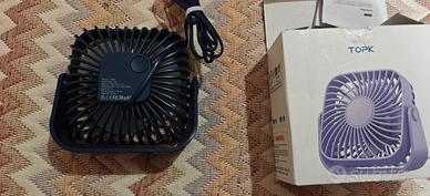 Ventola USB di colore blu. - Alimentazione tramite cavo USB. - Design compatto e portatile.