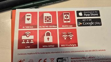 Usata solo per un emergenza di qualche giorno e poi riposto in un cassetto, vendo per totale inutilizzo Vodafone Mobile WIFI R216 4G, fino a 10 utenti collegati, 2G/3G/4G - 150 MBPS, WIFI 5ghz e 2,4 ghz 802.1.1abgh. Completo di scatola originale, batteria originale praticamente nuova, cavetto completo di spina. Consegno a mano a Milano o zone come Desio, Seregno, Lissone, Giussano oppure spedisco con subito.it