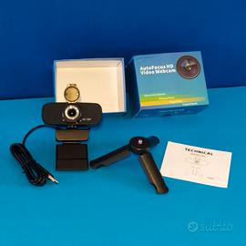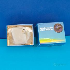 Webcam Fullhd plug & play con auto focus completa di scatola (leggermente ammaccata esternamente come da foto) NUOVA mai usata aperta solo per fare le foto, completa di privacy cover (tappo videocamera) microfono, piccolo treppiedi e manuale in inglese.