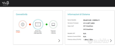 Vendo in blocco kit originale WindTre perfettamente funzionante e già resettato per passaggio ad altro operatore. Ideale come ricambio o per chi cerca una soluzione affidabile per fibra fissa e navigazione mobile. Il kit comprende: 1 - Modem Router ZTE ZXHN H389X con standard trasmissione WI-Fi 6 (Wind3 HUB): Versione Firmware V11 (come visibile nella quinta foto). Top di gamma con Wi-Fi dual band (2.4G e 5G). Usato circa 2 anni e mezzo, tenuto benissimo. 2 - WebPocket 4G LTE (ZTE MF927U): Nuovo Modem portatile Wi-Fi, acceso solo per test e reset. Batteria integra. ( Nota sulla sesta foto: la spia rossa sul WebPocket indica solo l'assenza della SIM durante il test, il dispositivo è perfettamente funzionante). 3 - Accessori: Scatola originale di entrambi i modem, alimentatore e cavi originali inclusi. Stato tecnico e Privacy: - Nota sulla compatibilità: I dispositivi sono stati utilizzati esclusivamente con rete WindTre. Essendo stati resettati alle impostazioni di fabbrica, la configurazione per altri operatori (sblocco/APN) è a carico dell'acquirente. Vendo con formula 'visto e piaciuto' - Console di gestione accessibile e pronta alla configurazione (come visibile nella quinta foto). - Password originali presenti sulle etichette (oscurate come nella terza e quarta foto per privacy). Prezzo: 40 € (kit completo) non trattabili Consegna: SOLO SPEDIZIONE tramite TuttoSubito (gestione sicura e tracciata). Non effettuo consegne a mano per motivi di lavoro.