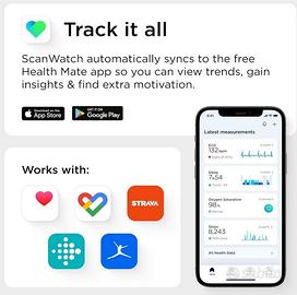 - SINCRONIZZAZIONE AUTOMATICA DEI DATI: ScanWatch si sincronizza con l'applicazione gratuita Health Mate tramite Bluetooth. È compatibile con Alexa, Apple Health, Google Fit, Strava e oltre 100 app