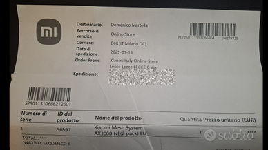 Sistema Mesh WiFi 6 Xiaomi AX3000 NE composto da 2 unità (1 principale + 1 satellite) per coprire casa/ufficio con un’unica rete stabile e senza zone d’ombra. - Perfettamente funzionante - Ottime condizioni - Acquistato il 13/01/2025 su store ufficiale Xiaomi, ancora in garanzia - Reset di fabbrica eseguito, pronto all’uso - Ideale per appartamenti su due piani / case con muri spessi - Configurazione semplice tramite app Xiaomi o browser Web - Copertura ottimale fino a 200mq Caratteristiche - Standard Wi-Fi: 802.11ax (AX3000 - Wi-Fi 6) - Rete mesh con roaming automatico - Un’unica rete Wi-Fi (SSID unico) per tutta la casa - Tecnologia MU-MIMO - Configurabile in modalità router o access point, con funzionalità avanzate QoS - 4 x Porte Ethernet 1Gps su ogni unità con possibilità di bonding Incluso - 2 unità (le unità sono identiche, ciascuna può operare indipendentemente, come master o come satellite) - Alimentatori originali - Scatola e manuali Motivo vendita Passaggio a sistema WiFi 7