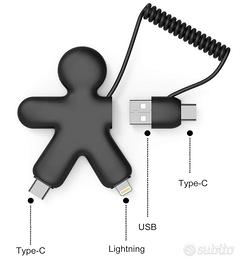 Cavo octopus Multi USB 4 in 1. Caricatore universale in plastica riciclata. USB, USB-C, Lighting, Micro USB, compatibile con tutti gli smartphone. Colore nero