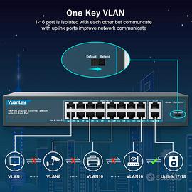✅【Funzione di estensione】 Supporta la modalità di estensione, le porte PoE 1-16 supportano l'isolamento VLAN, il traffico è isolato l'uno dall'altro, può comunicare solo con l'uplink 18-19 per ridurre la congestione della rete, migliorare le prestazioni della rete.