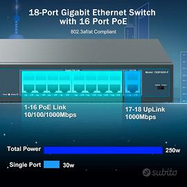 ✅【Tutte le porte Gigabit】Questo switch ethernet a 18 porte include 16 porte Gigabit PoE/PoE+, 2 Gigabit UpLink, tutte le porte fino a una velocità di 1000 Mbps, offre eccellenti prestazioni di rete.