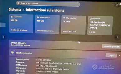Vendo notebook ASUS ZenBook 13 OLED (modello UX325EA), un ultrabook premium perfetto per chi cerca portabilità estrema (pesa solo 1,1 kg) e potenza.