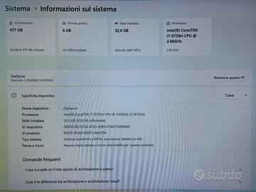 Zephyrus ROG da Gaming Processore I7-9750H 6 core 32Gb RAM Memoria ssd 521 Gb nVmi 6 Gb GPU Schermo 15 pollici 144 hz Windows 11 professional Slot libero per aggiungere un altro ssd nvmi Tastiera RGB, 3 led della tastiera sono spenti solo in un colore quindi solo esteticamente e in un colore non sono uniformi, prezzo molto basso per questo anche se non influisce minimamente nelle sue prestazioni. Batteria nuova. Vendo con scatola originale ed accessori. Usato per lo più con cad