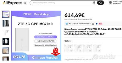ZTE MC7010. Caratteristiche principali in sintesi: router esterno 5G resistente alle intemperie (senza Wi-Fi). Migliore ricezione telefonica mobile grazie al montaggio esterno (senza perdita di segnale attraverso finestre o pareti in cemento). Possibilità di montaggio flessibile (parete di casa, balcone, tetto) 5G con fino a 3,45 Gbps DL e fino a 900 Mbit/s UL Speed LTE (Cat. 22) con fino a 2,4 Gbps DL e fino a 225 Mbps UL Speed Bridge Mode, DHCP, DMZ, Port Forwarding, Watchdog Service. Portate il 5G a casa vostra. Se la connessione 5G non è ancora possibile a casa vostra, un router esterno può aiutarvi. ZTE MC7010 garantisce una migliore ricezione del telefono cellulare in tutta la proprietà. Essendo montato in ambienti esterni, non vi è alcuna perdita di segnale da pareti in cemento o finestre, è possibile contare su una ricezione mobile fluida e senza problemi in tutta la casa. Possibilità di montaggio flessibile. Si può montare ovunque. Il suo alloggiamento resistente alle intemperie consente il fissaggio esterno al balcone o alla facciata. In questo modo non si verifica alcuna perdita di segnale attraverso pareti o finestre. L'installazione è semplificata grazie al supporto a parete e ai LED in dotazione, che servono come indicatore di potenza del segnale. Consente velocità elevate. Grazie allo standard di telefonia mobile 5G, il router ZTE MC7010 consente di scaricare velocità fino a 3,45 Gbps. Durante l'upload raggiunge una larghezza di banda fino a 900 Mbps. Questo rende il router ideale anche per attività impegnative come il gioco online o lo streaming 4K simultaneo su più dispositivi. Il router ZTE MC7010 è ovviamente utilizzabile anche nella rete 4G/LTE (fino al Cat 22).