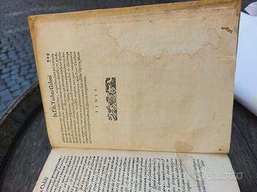 1574 Originale Medicina Antica Oddi/Galeno In Folio Completo Con annotazioni. Rara edizione originale stampata a Venezia nel 1574 dai fratelli Meietti. L’opera è il commentario all’Ars Medica di Galeno, redatto dal medico padovano Oddo degli Oddi e completato dal figlio Marco. Non si tratta di una semplice trasmissione della medicina antica: il testo introduce confronto critico, osservazioni e applicazione pratica. È un documento concreto della transizione tra sapere tradizionale e approccio più analitico nella medicina rinascimentale. 🔬 INTERESSE STORICO (senza retorica •Testo medico di alto livello accademico (ambito padovano) •Uso attivo, non solo teorico •Presenza di apparati grafici (diagrammi, schemi) •Esemplare “vissuto”, non da biblioteca sterile Questo è il punto forte, ma va gestito con precisione. 1. Nota in corsivo latino sul frontespizio •Testo: “Ex libris M. Barbarei … 1593” •NON coeva con la stampa •Grafia più tarda → probabile XVII–XVIII secolo •Funzione: indicazione di possesso (ex libris) ⸻ 2. Firma “Salvator Carassia” •Presente in altra parte del volume •Grafia compatibile con XIX secolo •Probabile proprietario successivo ⸻ 3. Scritta/numero in inchiostro blu •Colore e tratto chiaramente moderni •Probabile catalogazione (XX secolo) •In parte barrata ⸻ 4. Ulteriori numerazioni e segni manoscritti •Presenti su frontespizio e altre pagine •Numeri, sigle e piccoli appunti •Funzione: uso pratico (studio / inventariazione) •Epoche diverse (non un unico intervento)
