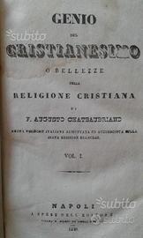 1) F. A. CHATEAUBRIAND, Genio del Cristianesimo o bellezze della religione cristiana, Napoli 1840, tomi 3 in unico volume (1°, pp. 243; 2°, pp. 187; 3° pp. 266). Alcune gore e margini esterni di alcune pagine rovinati da insetti. 2) OSSIAN, Poesie, traduzione di Melchiorre Cesarotti, Firenze, Poligrafia Italiana, 1846, pp. 564. Ottimo stato di conservazione.