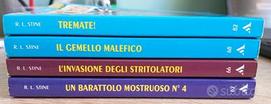 Vendo n.4 Piccoli Brividi - prime edizioni con adesivi, condizioni perfette. n. 62 - Un barattolo mostruoso n.4 n. 66 - L'invasione degli stritolatori Serie 2000 n. 68 - Il gemello malefico Serie 2000 n. 82 - Tremate! Serie 2000 Prezzo in blocco 50 euro, singolarmente 15 euro. Disponibili per la spedizione. Per info contattatemi.