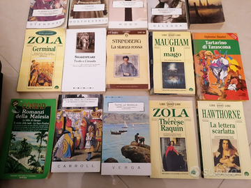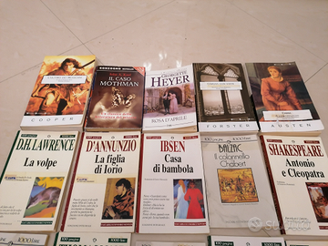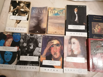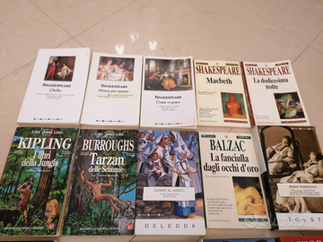 80 Libri Grandi Classici Collana Economica Newton, Mondadori ed Altre Edizioni.I libri presentano la mancanza di prefazione e/o mancanza delle pagine dove sono elencate le altre opere dell'autore come si vede nelle foto. L'opera però è completa nelle sue pagine. I titoli sono i seguenti :"Otello", "Misura per misura", "Come vi piace" " , "Macbeth" "La dodicesima notte" di Shakespeare, "I libri della Jungla" di Kipling,"Tarzan delle scimmie" di Burroughs, "Canne al vento" di Deledda, "La fanciulla dagli occhi d'oro" di Balzac, "Anna Karenina" di Tolstoj, "Le relazioni pericolose" di De Laclos, "Fahrenheit" di Bradbury, "Orlando" di Woolf, "Una vita" di Svevo, "I miserabili" di Hugo, "Il rosso e nero" di Stendhal, "I demoni" di Dostoevskij, "Il novantatre'" di Hugo, "Marianna Sirca" di Deledda, "Fiabe" di Andesen, "Germinal" di Zola, "Troilo e Cressida" di Shakespeare, "La stanza rossa" di Strindberg, "Tartarino di Tarascona" di Daudet, "Romanzi della Malesia" di Conrad, "Alice nel paese delle meraviglie e attraverso lo specchio magico" di Caroll, "Tutte le novelle" di Verga, "Therese Raquin" di Zola, "La lettera scarlatta" di Hawthorne, "Oliver Twist" di Dickens, "Il lupo della steppa" e "Poesie" di Hesse, "Le avventure di Gordon Pym", "Il tulipano nero" di Duma, "La signorina Else" di shnitzler, Peter Camenzid, Gertrud Rosshalde, Demian" Di Hesse, "Tempi difficili" di Dickens, "Il processo" di Kafka, "Figli e amanti" di Lawrence, "Magnifica preda " di Woodwiss, "sangue e arena" di Ibanez, "Casa Howard" di Forster, "La Freccia nera" di Stevenson, "Schiavo d'amore" di Maugham, "Piccole donne crescono" di Alcott, "Belli e dannati" di Fitzgerald, "Notre dame de Paris" di Hugo, Coriolano di Shakespeare, "La figlia del capitano" di Puskin,"L'ultimo dei Mohicani" di Cooper, "Il caso Mothman", "Rosa d'Aprile" di Heyer, "Camera con vista" di Forster, "Moll Flanders" di Defoe, "La volpe" di Lawrence, "La figlia di Iorio" D'Annunzio, "Casa di Bambola" di