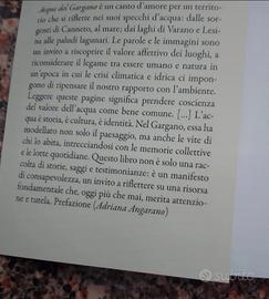 È una raccolta di voci,di memorie, immagini e testimonianze che intrecciano il rapporto tra le donne e l' acqua,intesa come simbolo di vita...un canto d' amore per la propria terra,il Gargano. Un libro che raccoglie saggi sul territorio,ma porta anche a riflettere sulla tutela delle risorse acquifere.