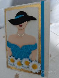 L'agenda con sagoma di donna in gomma Eva e fiori in carta è mensile e con copertina estraibile.