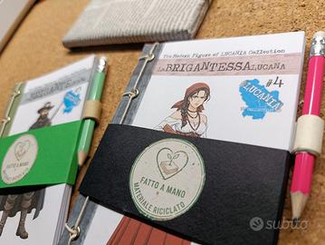 Agendina Sketchbook realizzata completamente a mano. Brigantessa Lucana. Disponibili altri personaggi della Lucania Materiale Riciclato: Ho scelto di utilizzare carta e materiali di recupero per restare in una filosofia Eco-Friendly. Ogni fibra ha una storia, proprio come i vostri pensieri. Fatti a mano: Ogni pezzo è unico, creato e rilegato con cura artigianale. Non ne troverete mai uno uguale all'altro. Tematiche in evoluzione e Personalizzabili: Troverete temi sempre nuovi e diversi. Se cercate qualcosa di ancora più speciale, potete richiedere una personalizzazione su misura.
