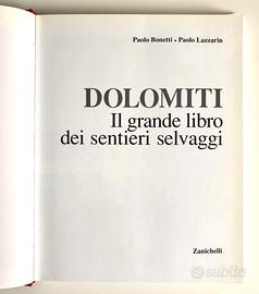 Paolo Bonetti e Paolo Lazzaroni, DOLOMITI - Il grande libro dei sentieri selvaggi, prima edizione novembre 1996, Zanichelli Editore. Volume perfetto, mai usato, conservato in modo ottimale, senza strappi, macchie o appunti. Copertina rigida in tela editoriale rossa con sovracoperta, senza strappi o consunzioni, 224 pagine, formato 22x28,5x3, peso 1,3 Kg., con allegato Fascicolo Descrizione degli itinerari.