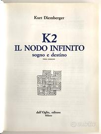 Kurt Diemberger, K2 IL NODO INFINITO - SOGNO E DESTINO, Dall’Oglio Editore, Milano 1988; Copertina rigida in similpelle blu con sovracoperta illustrata e fascetta editoriale originale, senza strappi o consunzioni, 270 pagine, formato 20x26,5x3, peso 1,3 Kg. Volume perfetto, mai usato, conservato in modo ottimale, senza strappi, macchie o appunti.