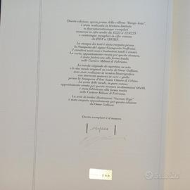 Le tre tavole e il testo sono racchiusi in un elegante cartella, formato cm 61x82, 4 cm al dorso, rivestita in seta nera Orient con opera del Maestro e sono numerate e firmate.