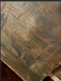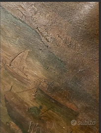 PREGIATO e STREPITOSO dipinto ad olio su pannello raffigurante "SCENA MARITTIMA con TORRE e BARCHE", FIRMATO. ANTICO riconducibile al XVII secolo. CONDIZIONI: buono stato conservativo ma essendo un articolo antico/vintage può presentare i lievi segni del tempo che ne attestano l'originalità e il fascino. Proveniente da collezione privata Villa Veneta del '900. MISURE: L40xh30xp2cm c.a. DETTAGLI: Questo dipinto rappresenta una scena fluviale crepuscolare tipica della tradizione paesaggistica europea del XVII secolo. L'opera mostra influenze della scuola olandese e fiamminga, caratterizzata da atmosfere notturne o al tramonto con architetture in rovina, barche e figure.