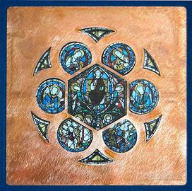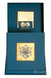 Prezioso cofanetto dedicato alla Basilica di San Francesco in Assisi, che racchiude un volume riccamente illustrato e la riproduzione d'una pergamena di papa Innocenzo IV (1195-1254). Edito da NCT Global Media e intitolato 750 anni tra incontri e dialogo, il libro contiene centinaia di immagini dedicate a coloro che, dall'anno della consacrazione della Basilica fino al 2004, si sono recati ad Assisi per incontrare i Frati conventuali. Le foto ritraggono personalità del clero, delle istituzioni politiche e del mondo della cultura, ma immortalano anche la gente comune giunta in pellegrinaggio da ogni dove. La copertina è in cartone rivestito di tela blu ed è impreziosita, al piatto anteriore, da una placca di rame e smalti raffigurante il rosone posto sopra la quadrifora della Basilica Superiore. Fatto interamente a mano con cartone telato, il cofanetto ha titoli impressi in oro, reca una tasca interna contenente la pergamena ed è dotato di un leggio apribile. Dimensioni: 33x6x34 cm.