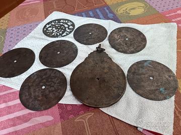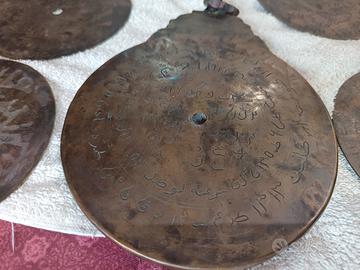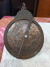 Astrolabio, primi del '900, in ottone, di provenienza arabo /persiana, con incisioni a mano, completo di Barra girevole ( alidada), senza perno centrale originale, diam 15 cm, completo con sette dischi