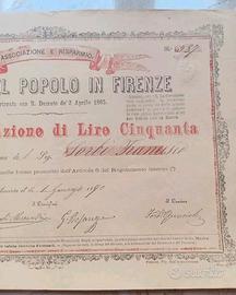 Banca del Popolo in Firenze - 1 Gennaio 1870 - Cartella di azione di lire cinquanta n. 587 - novantottesima serie - timbro a secco.