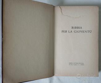 Bibbia per la gioventù, edizione 1960,ritrovata in un vecchio scatolone di libri, buone condizioni generali, tuttavia presenta un leggero difetto sulla costola, ed ha uno strappo in una pagina, come si vede in foto.