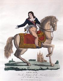 Figlio di Luigi XVI di Francia e di Maria Antonietta d’Asburgo-Lorena, Luigi Carlo di Borbone (1785-1795) ebbe vita breve e sofferta. Morti i genitori sulla ghigliottina, divenne re per titolo ereditario col nome di Luigi XVII. Non solo non poté regnare ma visse prigioniero i suoi ultimi anni, chiuso in una cella sporca e infestata da parassiti, denutrito e consumato dalle malattie. Le tappe dell’infelice storia di Luigi XVII sono ripercorse attraverso le immagini di questo libro. Pubblicata nel 1937 dalla libreria Floury di Parigi, l'opera si intitola “Louis XVII. Quarante-deux documents originaux et iconographiques”. È un volume di 25x33 cm. rilegato a filo, con copertina in cartonato e sovraccoperta ornata da un'illustrazione al piatto anteriore. Le 26 pagine di testo introduttivo sono accompagnate da 42 riproduzioni in facsimile di documenti e di immagini d’epoca (di cui una in sovraccoperta). Di cruda evidenza storica sono i documenti, fra cui si segnalano i verbali dell’interrogatorio cui fu sottoposto il bambino e il resoconto dell’autopsia eseguita sul suo cadavere. Il libro fu tirato in 1000 copie numerate e 40 esemplari fuori commercio. La copia qui proposta è la n. 331/1000.