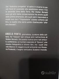 Un salto di qualità Introduzione di Angelo Ponta La ferita e il trionfo Tra il 1952 e il 1955 la carriera di Walter Bonatti spicca, è il caso di dirlo, un balzo verso l'alto. La vittoriosa spedizione italiana al K2, pur con le ferite che quell'avventura genera, rappresenta un pal-coscenico e un trampolino:al ritorno dal Karakorum Bonatti e compagni diventano delle celebrità itineranti, e tra ivari nuovi contatti del giovane alpinista si stabilisce,saldo, quello con Bardonecchia, che gli offre un lavoro importante e gli consente di abbandonare il rifugio aperto sulla Grigna. Bonatti entra così nella fase cruciale del professionismo: la strepitosa scalata del Dru gli consente di porre Lle basi per il suo"trasloco" a Courmayeur, vicino a quel Monte Bianco che diventerà il suo "parco giochi" (parole suel e il teatro principale dei successivi dieci anni di alpinismo. La salita sul Dru offre però a Walter anche un'altra opportunità: le foto e il racconto di quella incredi-bile avventura diventano infatti, nel maggio 1955, il primo articolo a sua firma pubblicato su "Epoca" Non è ancora l'inizio di una vera collaborazione, ma pone le basi per un rapporto che darà i suoi frutti nei primi anni Sessanta per sfociare infine, nel 1965, nell'assunzione da parte del settimanale e nella radicale trasformazione della vita di Bonatti, da alpinista estremo a fotoreporter d'avventura A proposito della fotografia, vale la pena di segnalare un curioso, ricorrente malinteso. Abituati come siamo a vedere Walter protagonista dei suoi stessi reportage [quelli per "Epoca", appunto, nei quali utilizzò massicciamente l'autoscatto per fotografarsi durante le proprie avventurel, spesso dimen-tichiamo che le foto degli anni dell'alpinismo ovviamente non sono "di" Bonatti, ma"con" Bonatti. Negli anni Quaranta e Cinquanta l'autoscatto,soprattutto in parete, non era praticabile: quindi se vediamo Walter in azione è perché qualcuno dei suoi compagni di cordata lo fotografò. Eppure, tale è la for