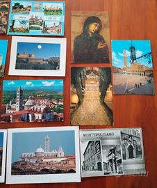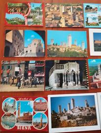Sedici cartoline viaggiate raffiguranti Siena e la sua provincia. Diverse vedute di Siena, tra cui il Duomo, il Palio e Piazza del Campo; molte di San Gimignano e altre località della provincia. Una in bianco e nero di Montepulciano.