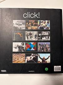 tratta di "Click! Ediz. italiana, spagnola e portoghese", un libro multilingue di fotografia edito da Logos. La copertina presenta un'immagine in primo piano in bianco e nero di un obiettivo fotografico vintage, identificabile come un obiettivo Novar Anastigmat con iscrizioni come "f=75mm".