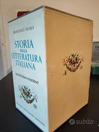 Storia della Letteratura Italiana di Francesco Flora. Undicesima Edizione 1959. Mondadori Editore. L'opera si compone di 5 volumi ben tenuti. Lievi ombrature del tempo. Il cofanetto è stato riparato in alto a sinistra come visibile dalla foto. Le sovraccoperte presentano qualche lievissima menda.