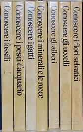 Collana "Conoscere", 7 libri con illustrazioni e disegni 1) I minerali e le rocce 2) I fiori selvatici 3) I gatti 4) Gli uccelli 5) I pesci d'acquario 6) Gli alberi 7) I fossili Euroclub/Varia Club, anni 80.
