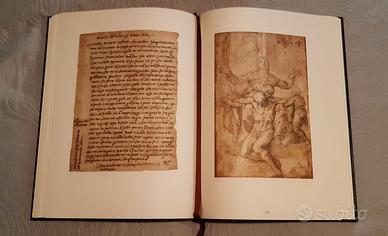 Corpus dei disegni di Michelangelo. Edizione limitata di 999 copie numerate in numeri romani. 4 volumi con corrispettivi faldoni, 3 volumi ancora incartati, 1 aperto per fotografie. Baule originale non in perfette condizioni ma utile per il trasporto. Peso tot.: 26Kg Dimensioni volumi cad.: 45x32x6