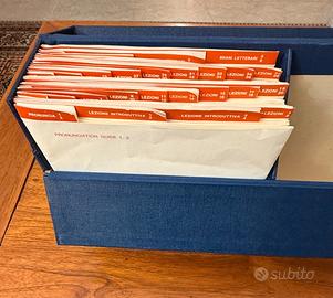 Corso di inglese nel cofanetto originale completo di 25 dischi in vinile 33 giri, tre libri di testo, dizionario e antologia di brani letterari scelti. Pubblicato da Selezione del Reader's Digest, anni 60. Dischi e libri in condizioni eccellenti, segni del tempo sulla confezione (v. foto).