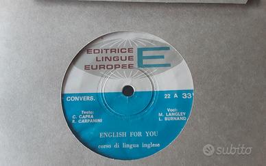 Corso di lingua inglese "English for you" , Editrice lingue Europee, di C.Capra ed E.Carpanini. Il corso è composto da un libro di testo e 30 vinili. Mai utilizzato, come nuovo.