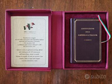 Cofanetto in tela con applicazione del logo ufficiale delle celebrazioni del 150° anniversario dell'unità d'Italia, coniato in metallo, laminato in oro giallo 18 carati.