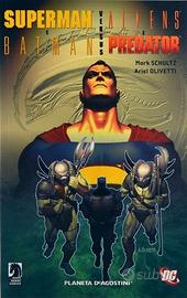 "Superman e Batman, alleati storici, si trovano, in questa graphic novel, in forte disaccordo al momento di affrontare una crisi su scala planetaria. Nelle profondità delle Ande, un vulcano addormentato si risveglia in modo spettacolare rivelando un terribile segreto: due razze provenienti dallo spazio remoto sono segretamente sulla Terra e desideano rimanerci, la prima sfrutta tutto ciò che incontra per sopravvivere e permettere alla propria specie di riprodursi; l'altra è l'evoluzione di una cultura di individui cacciatori con un rigido codice comportamentale. editi dalla Dark Horse." Volume del team creativo Mark Schultz & Ariel Olivetti che mette a confronto i 2 personaggi più iconici della DC Comics contro i 2 alieni per eccellenza del mondo dei comics editi dalla Dark Horse.