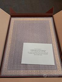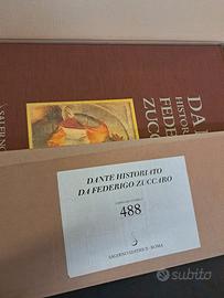 volume di pregio di grandi dimensioni rilegato in pelle con incisioni in oro . 89 tavole che illustrano il poema Dantesco,si trovano all interno il contenitore cartonato. come si vede dalle foto l oggetto è nuovo ancora avvolto nella carta protettiva. con scatola e controscatola(dove c è l etichetta che indica il numero dell esemplare 69,5 x 55 centimetri peso kg 19,5