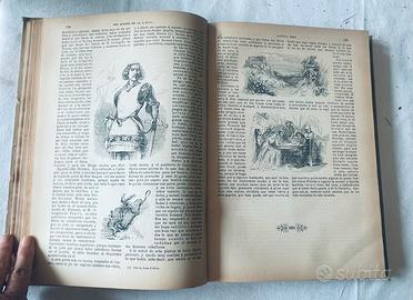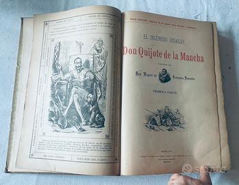 Don Quijote de la Mancha – Edizione illustrata fine ‘800 (Barcellona) Bellissima edizione illustrata del celebre romanzo di Miguel de Cervantes, “Don Quijote de la Mancha”, stampata a Barcellona da Felipe Ponse e appartenente alla collana “Museo Excelsior”. Caratteristiche: Testo completo (prima e seconda parte) in lingua spagnola. Presente il raro testo aggiuntivo “Buscapié” (con dicitura “Fin del Buscapié”) Ricchissimo apparato iconografico con illustrazioni in quasi tutte le pagine Copertina originale illustrata d’epoca Rilegatura “Encuadernaciones Julián Prieto” (Barcellona) Epoca: fine XIX secolo (circa 1890) (il frontespizio riporta data in numeri di gusto editoriale) Condizioni: Copertina con segni del tempo Dorso in pelle con fregi dorati e segni del tempo Interno complessivamente in buono stato, con pagine integre e ben leggibili Volume molto decorativo e affascinante, ideale per collezionisti, appassionati di libri antichi o come elemento d’arredo. A dispisizione per altre foto, prezzo ragionevolmente trattabile