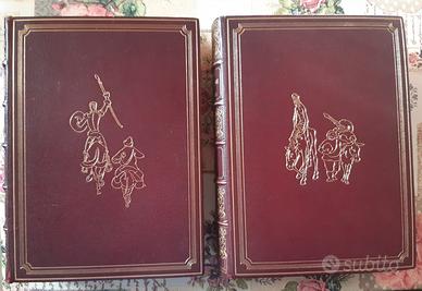 Coppia di preziosi libri in lingua spagnola. La copertina é in cuoio lavorata dal Maestro Brugalla e illustrati dal pittore Joaquin Vaquero