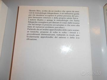 1) "Santa Ildegarda. Disintossicazione. Consigli per l'autoterapia", Reinhard Schiller. Scritto da un medico che opera da anni con le metologia ildegardiane, è un'utilissima guida per chi desidera occuparsi in prima persona del proprio benessere interiore e della propria salute fisica. L'Autore illustra e spiega le metodologia che Santa Ildegarda consigliava per liberare il corpo dalle tossine che nel tempo si possono accumulare e che sono alla base di numerosi problemi psicofisici. Partendo da un'analisi approfondita delle varie sostanze tossiche, propone di volta in volta i rimedi ed i procedimenti disintossicanti, trattando in modo particolarmente approfondito del salasso e della scarificazione. 2) "Santa Ildegarda. Ginecologia, medicina olistica per la donna", Claus Schulte Uebbing. Con le sue capicità di veggenza, che le permisero di considerare la realtà con un'ottica diversa, Ildegarda precorse i tempi ed oggi non solo può essere considerata la vera fondatrice della moderna medicina psicosomatica, ma anche la prima dottoressa della medicina ambientale. Infatti nella descrizione delle malattie, la Santa tiene in considerazione sia i fattori psichici, sia quelli ecologici ed esorta sempre a recuperare le virtù terapeutiche della Natura ed a riconsiderare le correlazioni fra corpo ed anima. Ildegarda si occupò a fondo anche della genesi, della cura e soprattutto della prevenzione delle malattie ginecologiche. In questo libro il curatore, dottor Claus Schulte Uebbing, medico ginecologo, ha raccolto e spiegato tutte le indicazioni terapeutiche della Santa, per prevenire e curare i disturbi delle donne. I libri sono nuovi, non fruiti (magazzino), scarsamente reperibili. Spedizione con pacchetto raccomandato (€ 5,00). Disponibili nel canale anche: - "Segreti e rimedi di Ildegarda di Bingen", - "Ildegarda di Bingen. La vita e l'opera", - "Le cure miracolose di suor Ildegarda", - "Libro delle creature. Differenze sottili delle nature diverse", ed altri (foto n. 6).