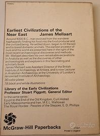 Volume in lingua inglese “Earliest Civilizations of the Near East” di James Mellaart, pubblicato nel 1965 (Thames and Hudson / McGraw-Hill Paperbacks). Testo divulgativo ma autorevole che tratta le prime civiltà del Vicino Oriente, con particolare attenzione alla nascita dell’agricoltura, delle prime comunità stanziali e agli sviluppi culturali e sociali fino alle grandi civiltà storiche. L’autore, noto archeologo, integra dati di scavo e scoperte recenti (per l’epoca), con ricco apparato illustrativo. Periodo: 1965 Condizioni: Condizioni complessive buone: copertina con leggeri segni d’uso e piccoli segni agli angoli dorso in buono stato pagine interne ben conservate, con lieve ingiallimento naturale nessuna mancanza o scritte evidenti Caratteristiche: 30 tavole a colori 78 illustrazioni in bianco e nero Dimensioni: 14,5 x 21 cm Pagine: 143