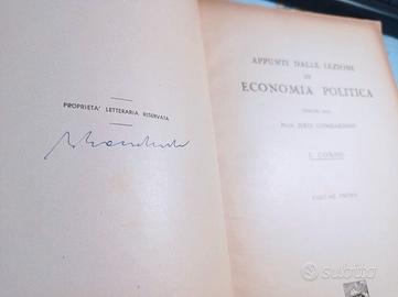 APPUNTI DALLE LEZIONI DI ECONOMIA POLITICA TENUTE DAL PROFESSORE SIRO LOMBARDINI . LIBRO CON FIRMA AUTOGRAFO - FIRMA DEL PROFESSORE SENATORE LOMBARDINI IN PERSONA . - MILANO LA COLLARDICA - FINITO DI STAMPA NEL DICEMBRE 1960 - FORMATO : 24 CM X 17,5 CM - 171 PAGINE - LIBRO USATO Siro Lombardini (Milano, 3 luglio 1924 – Chieri, 25 ottobre 2013) è stato un economista e politico italiano. Si laurea in Economia e commercio nel 1946 alla Università Cattolica del Sacro Cuore di Milano. Docente ordinario di Politica economica, ottenne varie cattedre universitarie, diventa un economista di fama internazionale tanto da venir nominato direttore dell'Istituto di ricerche economico e sociali del Piemonte (IRES Piemonte) dal 1958 al 1968 e da essere chiamato (1963) come visiting professor alle Università di Leningrado, Parigi e Cambridge. Fu presidente dell'ISCOM di Torino, presidente dell'Associazione italiana prefabbricati di Milano, amministratore Standa, SIFA, GONDRAND e Taverna Genova. Fece parte del Comitato scientifico della Fondazione Luigi Einaudi di Torino e del comitato scientifico dell'Istituto lombardo di studi economici e sociali. Lombardini è attivo anche politicamente, è infatti consulente economico per la Presidenza del Consiglio dei ministri e per vari ministeri. Nella VII Legislatura fu eletto senatore nella Democrazia Cristiana (1976-1979) nel collegio Lombardia. Il 4 agosto 1979 (VIII Legislatura) fu nominato Ministro delle partecipazioni statali nel primo governo Cossiga, e si trovò incolpevolmente a fronteggiare il cosiddetto "scandalo delle tangenti ENI", ereditato dal suo predecessore. Restò ministro fino al 3 aprile 1980. Inoltre, Lombardini è stato presidente dell'Istituto Bancario Italiano e della Banca Popolare di Novara, da lui portata alla fusione con la Banca Popolare di Verona, dando poi vita all'attuale Banco Popolare. Nel 1995 gli è stato assegnato, insieme a Francesco Salamini, il premio Invernizzi conferito dalla omonima Fondazione